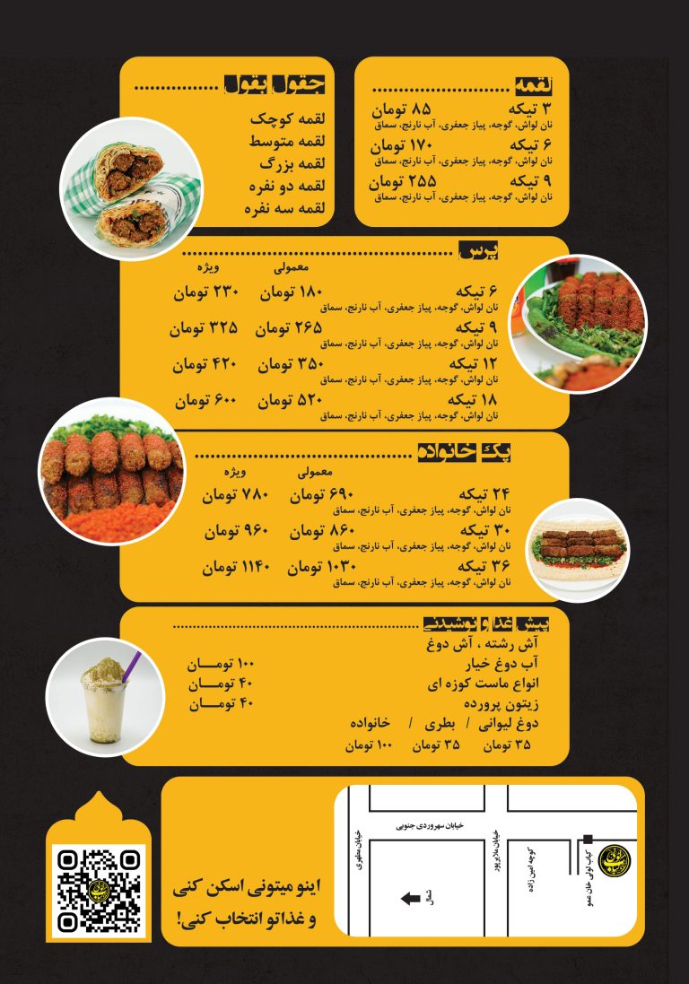 نمایش منو و سفارش کباب لولی خان عمو (سهروردی) کباب لولی خان عمو (سهروردی) سفارش تلفنی (کلیک کنید) ما را در اینستاگرام دنبال کنید (کلیک کنید) مسیر یابی خان عمو (سهروردی) خیابان مطهری، خیابان سهروردی جنوبی، نرسیده به خیابان بهار شیراز، نبش کوچه امین زاده، جنب رستوران اروند رود، پلاک 20